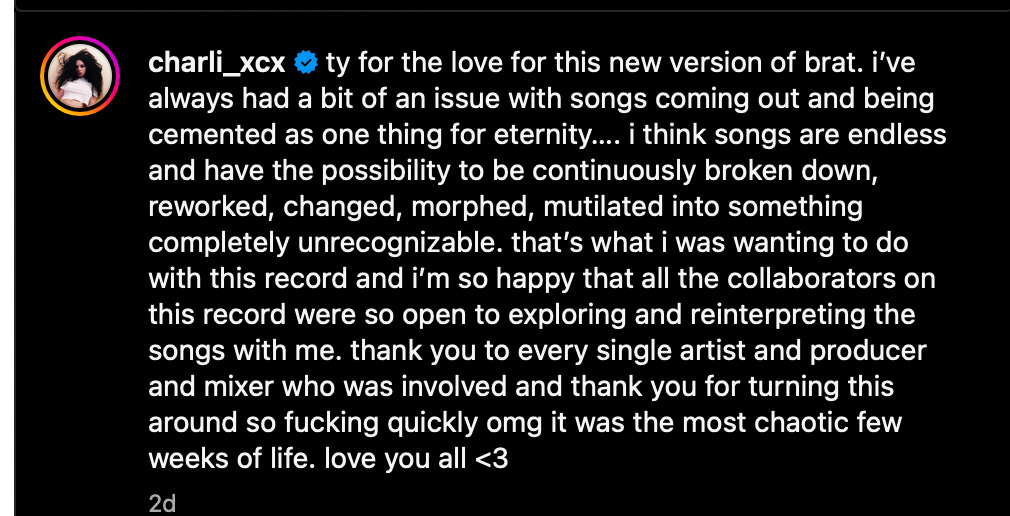 Charli posted the following post on Instagram this weekend, and it got me thinking about writing. I’ve been stuck in a bit of writing paralysis lately, unsure of what is good enough to post, writing out half-baked ideas, continuously editing, and eventually abandoning dozens of drafts because they aren’t perfect. Something about this album, though, stirred something up in me. It’s not necessarily the evocative lyrics or emotional melodies as much as it’s the iterative elasticity of creating a piece of art, only to then completely rework it into an entirely new (but also still brat) product.